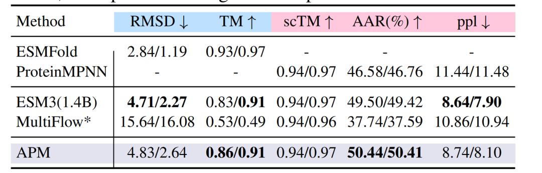折叠任务中,在 PDB 数据集上,APM 的 RMSD 为 4.83/2.64,TM-score 达 0.86/0.91,与 ESM3 、 MultiFlow 等模型性能相当;逆折叠任务中,氨基酸回收率(AAR)达 50.44%,超越 ProteinMPNN 的 46.58% 。