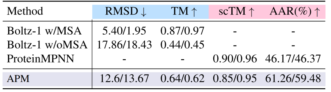 折叠与逆折叠的实验中,在 2-6 链复合物上,APM 的折叠性能为 12.6/13.67,虽低于 Boltz-1,但在无 MSA 条件下显著超越 Boltz-1;逆折叠的 scTM 达 0.85/0.95,接近带 MSA 的 Boltz-1,证明序列-结构关联的有效性。实验结果如下图所示。