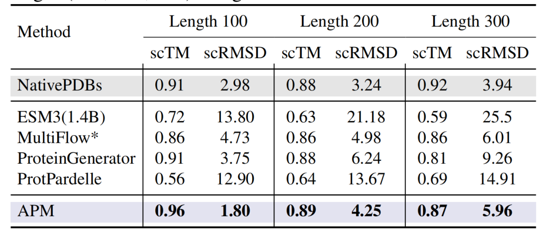 此外,如下图所示,在无条件生成的长度为 100-300 的残基蛋白中,APM 的 scTM 达 0.96(Length 100),scRMSD 低至 1.80,显著优于 ESM3(1.4B)、 ProtPardelle 等全原子设计模型。