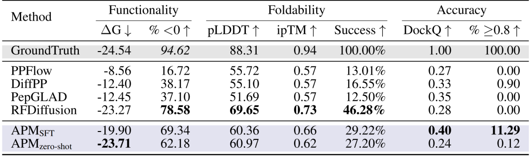 肽段设计:在 PepBench 和 LNR 数据集上,研究人员从功能性、可折叠性和准确性三个关键方面对肽设计方法进行全面评估。如下图所示,APM(SFT)的结合能 ΔG 达 -19.90,69.34% 样本 ΔG<0,DockQ≥0.8 的比例达 11.29%,远超 PPFlow 、 PepGLAD 等方法,且折叠稳定性(pLDDT 60.36,ipTM 0.66)优异。