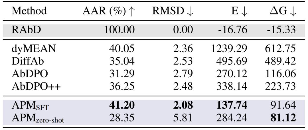 抗体 CDR-H3 设计:在 RAbD 基准测试中,APM 的 AAR 达 41.20%,RMSD 为 2.08,结合能 ΔG 为 91.64,全面超越 dyMEAN 、 DiffAb 等方法;零样本生成的抗体虽序列与天然差异大,但结合能更优(ΔG 81.12),证明其通用结合能力。
