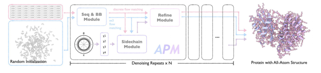 APM 的核心架构由序列与 backbone 生成模块(Seq&BB Module)、侧链生成模块(Sidechain Module)和全原子优化模块(Refine Module)3 个功能明确的模块协同组成,通过创新的设计实现了从序列到全原子结构的端到端生成,同时支持多链蛋白质的各种设计任务。