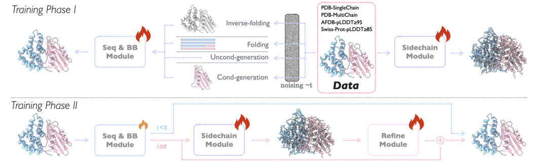 * 解耦噪声过程:将序列与结构的噪声过程分离,避免传统方法中模态间依赖关系的破坏。噪声序列与噪声 backbone 的时间步独立采样,确保模型能够学习双向的序列-结构依赖关系。