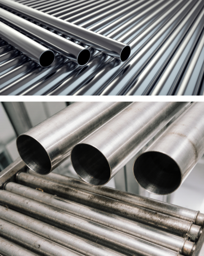 There is a row of stainless steel pipes neatly arranged at the bottom, and three horizontally placed stainless steel pipes at the top, with the pipe openings facing outward at a 45° angle to the right.