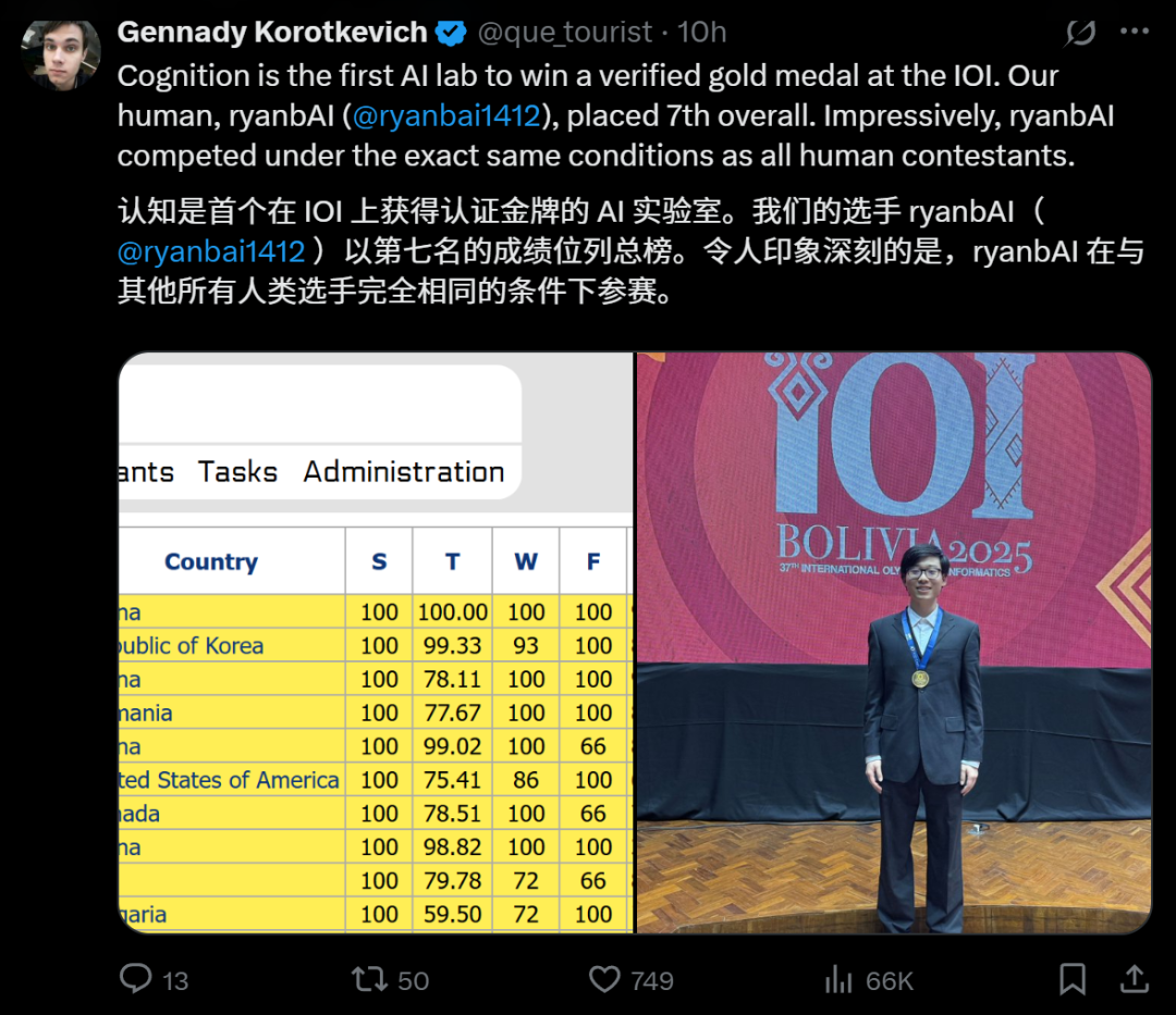 在玻利维亚第37届国际信息学奥林匹克竞赛(IOI 2025),ryanbAI在与其他人类选手完全相同的条件下参赛,以第七名的成绩位列总榜。