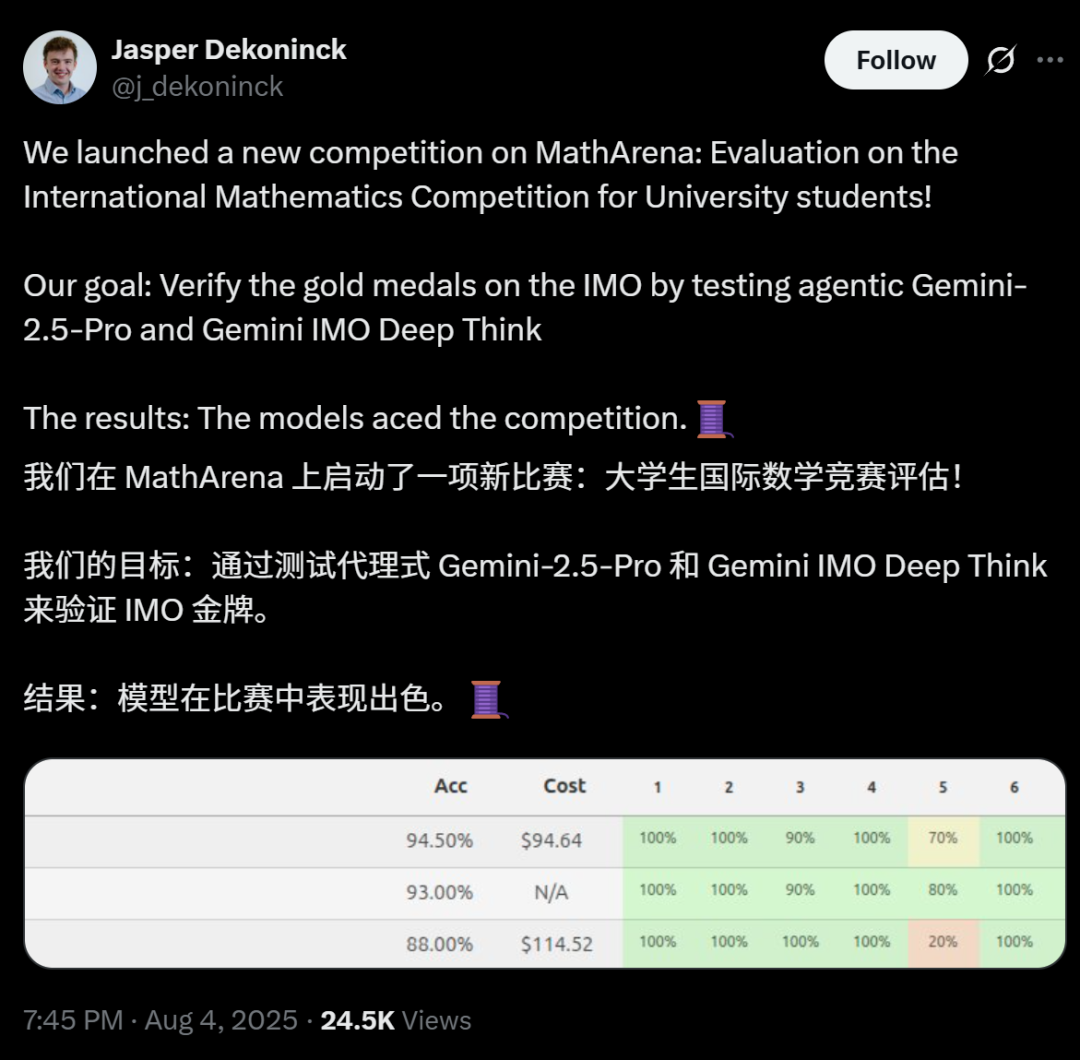 近日,在MathArena上,苏黎世联邦理工学院SRI实验室博士生Jasper Dekoninck,启动了一项新比赛:大学生国际数学竞赛(IMC)。