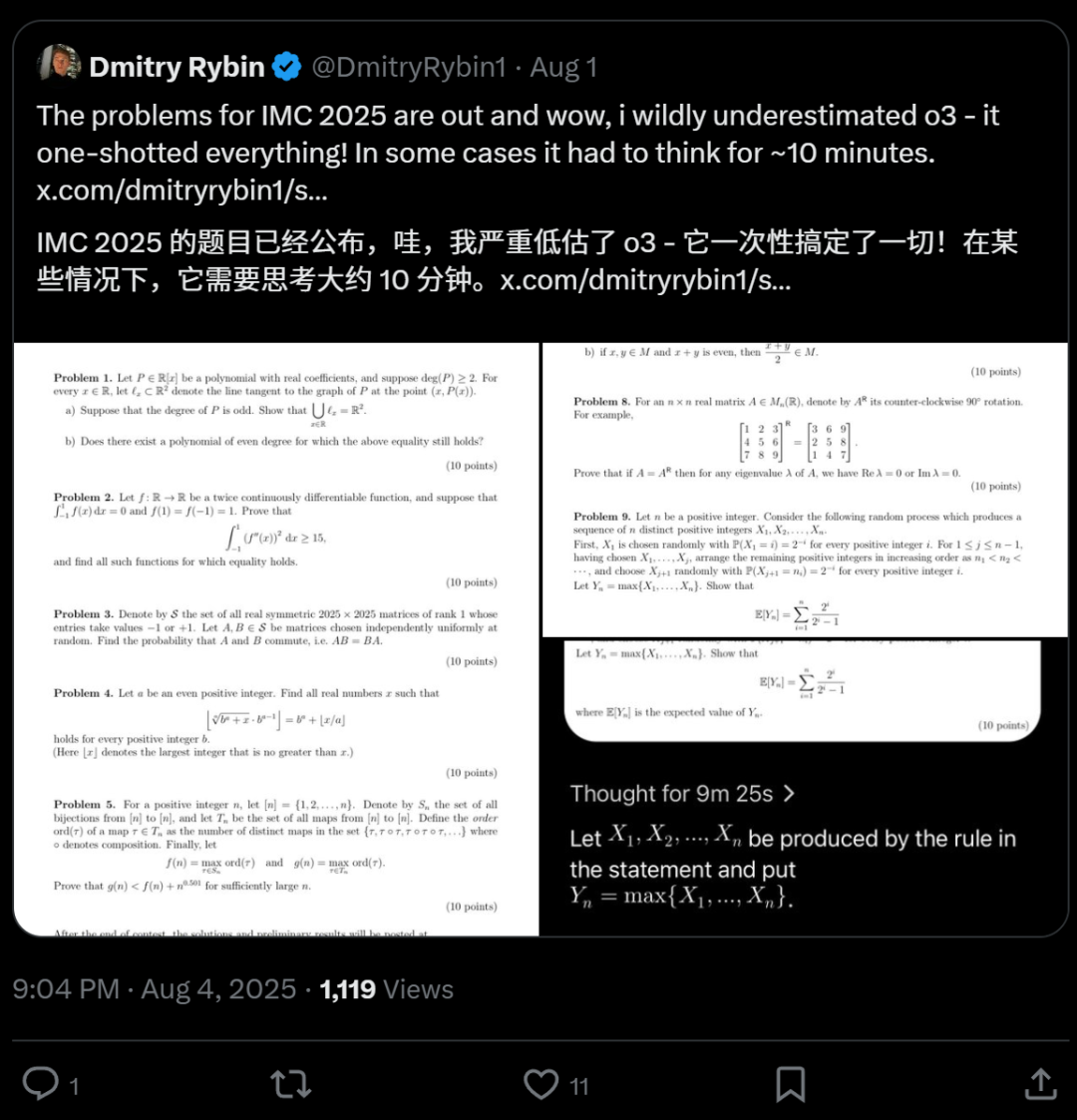 他还用o3测试了IMC2025年全部试题,大约十分钟它就搞定了10道题目。