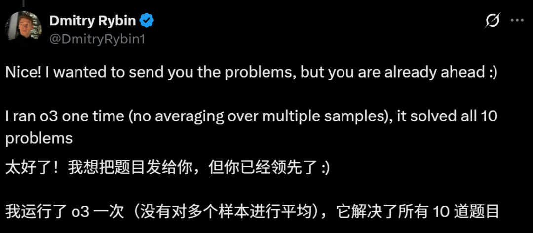 网友Dmitry Rybin表现出了对测试的极大热情:「太好了,本来我想把题目发给你,但你已经做了」。