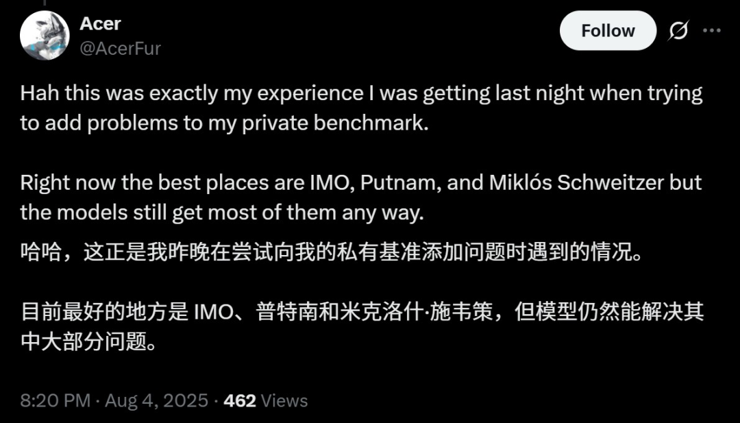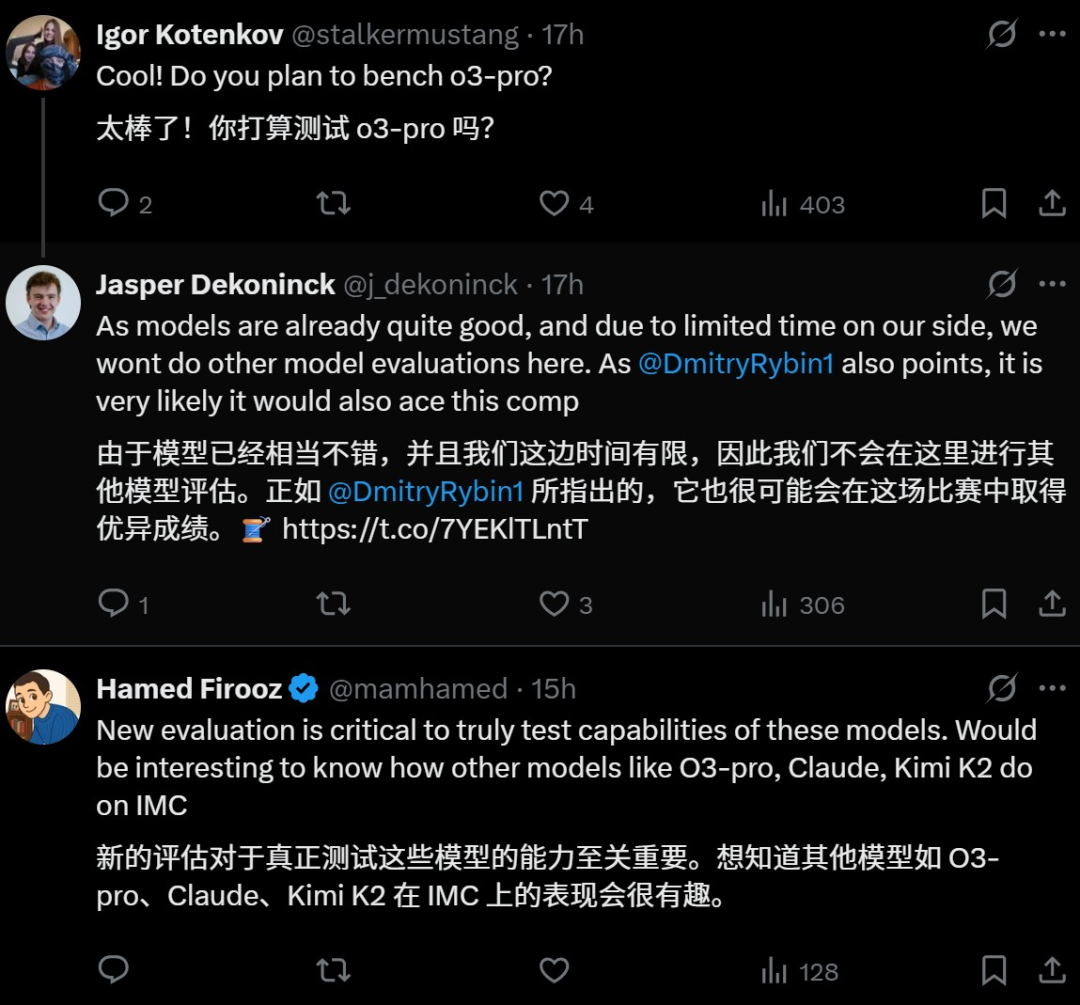 新的评估对于真正测试模型的能力至关重要,有网友已经迫不及待想要看到o3-Pro、Claude、Kimi K2在IMC考试中的表现。