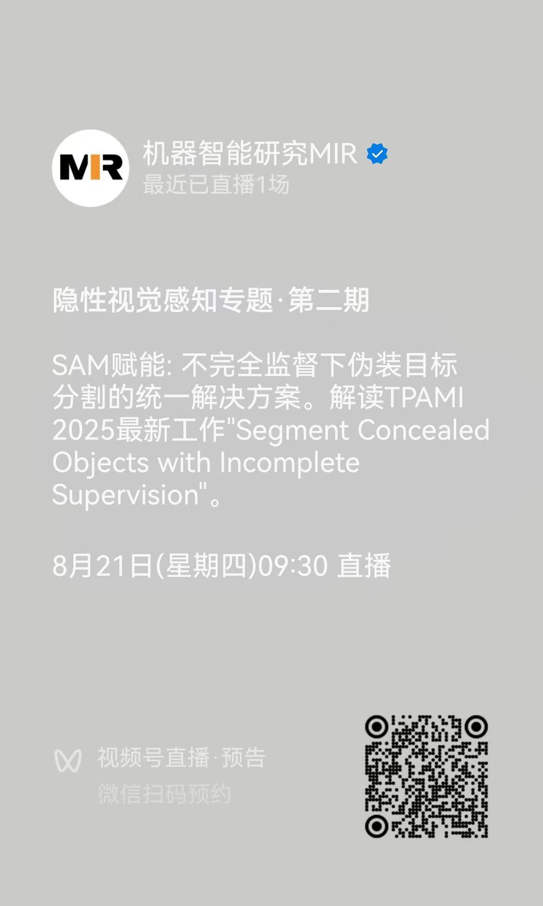 直播通道③:机器智能研究MIR 视频号
