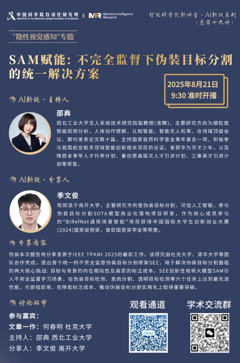 本次报告将分享发表于IEEE TPAMI 2025的最新工作"Segment Concealed Objects with Incomplete Supervision"。该研究由杜克大学、清华大学等团队合作完成,提出了首个统一的不完全监督伪装目标分割框架SEE,用于解决伪装目标分割(COS)面临的两大核心挑战:目标与背景的内在相似性以及高昂的标注成本。SEE创新性地将大模型SAM引入不完全监督学习场景,通过精心设计的伪标签生成、存储与监督策略,结合混合粒度特征分组模块,在弱监督(仅需点/涂鸦标注)和半监督(1/8和1/16标注数据)设置下均实现显著性能提升。该框架在伪装目标检测、息肉分割、透明目标检测等六个任务上达到最先进性能,可作为即插即用解决方案提升现有方法效果,为降低标注成本、推动伪装目标分割实用化提供重要突破。
