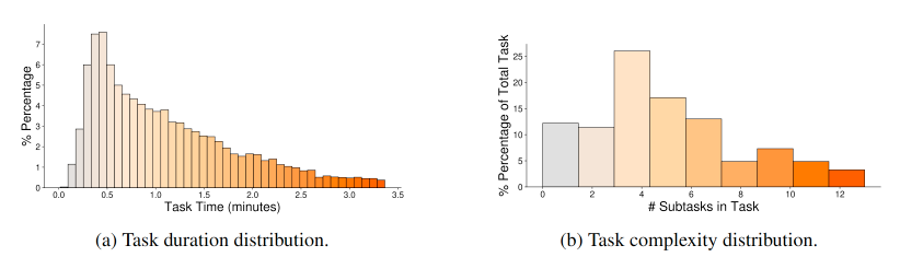 数据集任务统计,时间特征和结构特征:(a)任务完成时间的分布显示,大多数任务的时长处于中等范围,但数据集中也包含大量复杂且长时间跨度的任务。(b)任务复杂度(以每个任务所包含的子任务数量衡量)呈现出较大差异,涵盖了从简单动作到复杂多步骤流程的广泛范围。