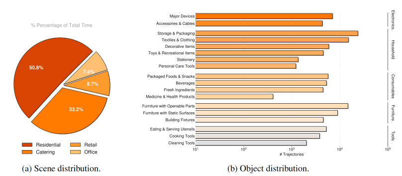 数据多样性统计:(a)总交互时间的分布显示在四个主要场景类别中:住宅、零售、餐饮和办公。(b)轨迹数量呈现了丰富的对象子类别,这些子类别被归类为更广泛的类别,如电子产品、家居用品和家具等,用以展示数据集中广泛的可交互物品范围。