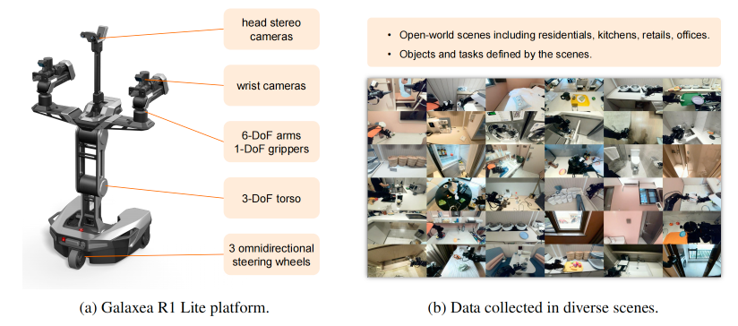 星海图开放世界数据集基于统一的机器人平台(星海图R1 Lite)采集,硬件配置正装双6自由度机械臂、3自由度躯干、可全向移动的底盘,以及多视角RGB-D摄像头。