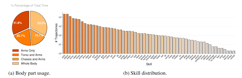 动作数据统计:(a)按身体部位使用情况划分的交互时间分布,展示了动作类型的多样性,从单纯的“仅手臂”操作到协调的“全身”动作。(b)技能的长尾分布凸显了数据集中丰富的动作词汇,既涵盖了高频、基础的动作(如“抓取”、“放置”),也包括了大量更为专业化的技能。