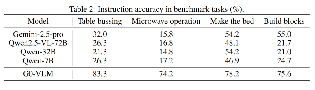 少样本迁移实验显示,单本体预训练可显著提升适应性,仅用20条轨迹即可在新任务中实现平稳、连贯的执行。针对G0-VLM的任务特定指令微调(SFT)进一步提升了指令-动作对齐的准确率,增幅超过 50%,在基准测试中任务分解的正确率接近100%。