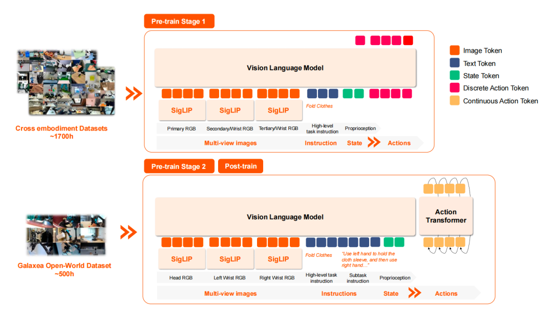 第二阶段单本体预训练(Stage-2),利用Galaxea Open-World Dataset在目标机器人平台上训练全模型,强化语言与动作的精确对齐,并适配平台的动力学与运动学特性。