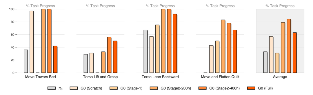 △不同预训练VLA模型在铺床任务各子技能及平均进度的表现对比,G0(Stage-2)相关模型多占优势。