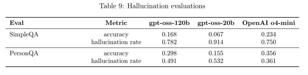 OpenAI官方公布的数据已经显示,GPT-oss-120b和GPT-oss-20b在基准测试PersonQA中的幻觉率分别达到了49%和53%。
