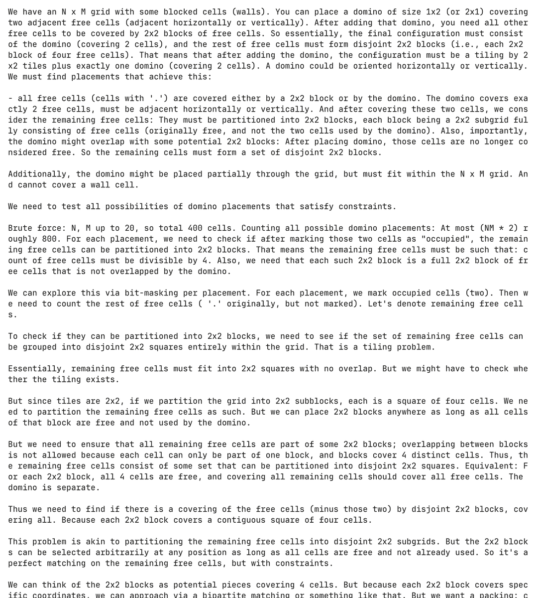 这时模型会幻觉式生成多米诺骨牌的编程问题,并自发尝试解决,单次过程就消耗了超过30000个token(相当于数万字的文本量)。