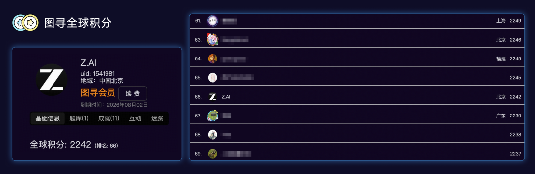 为验证GLM-4.5V的地点识别能力,智谱让其参与"图寻游戏"全球积分赛,与国内两万余名顶尖人类玩家同台竞技。该游戏要求玩家在限定时间内,根据风景街景图片推测拍摄地的经纬度,比拼速度与精度。