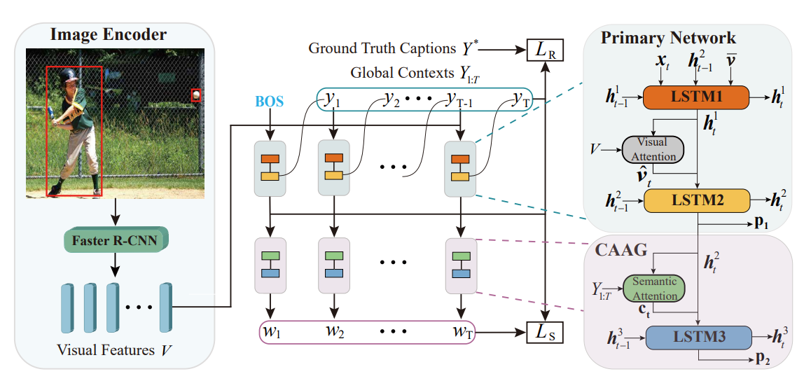 在本文中,作者提出了一种考虑上下文的辅助引导(CAAG)机制,它可以引导图像描述模型感知全局文本。在图像描述模型之上,CAAG 应用了语义注意力,选择性地关注了全局预测中的有用信息,从而重新生成当前的描述结果。