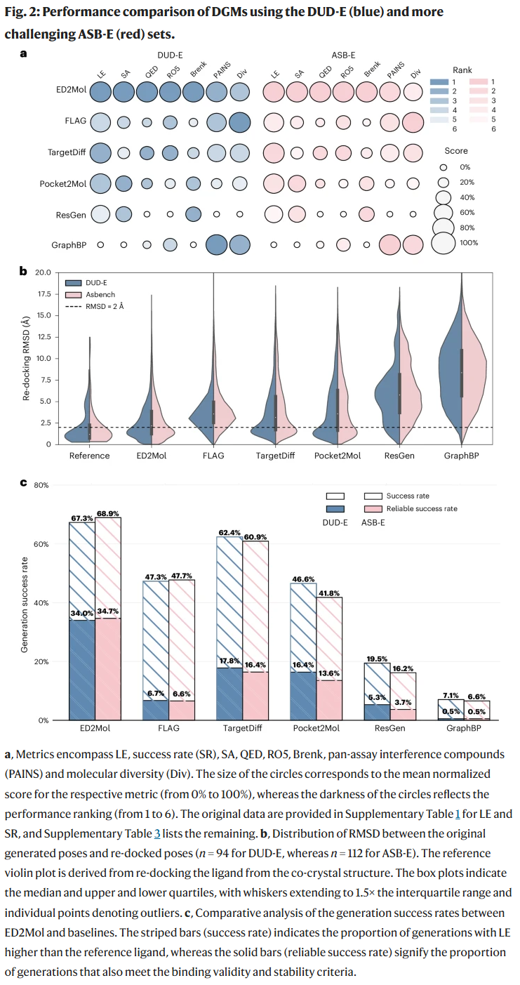 进一步的配体效率分析显示,ED2Mol 在两个基准数据集上的生成成功率最高,并且在更具挑战性的变构口袋数据集上仍保持稳定性能。通过 PoseBusters 标准评估分子结构有效性,ED2Mol 生成的分子在 97% 以上符合要求,远超其他模型。再对接实验表明,ED2Mol 生成分子的结合构象稳定性最佳,可靠成功率超过 34%,是表现第二好的模型的两倍以上。