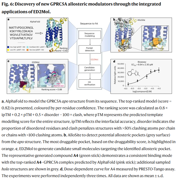 GPRC5A 变构调节剂:借助 AlphaFold 结构预测结合 AlloSite 口袋识别,ED2Mol 从头生成分子 A4,实验验证其为活性激活剂。