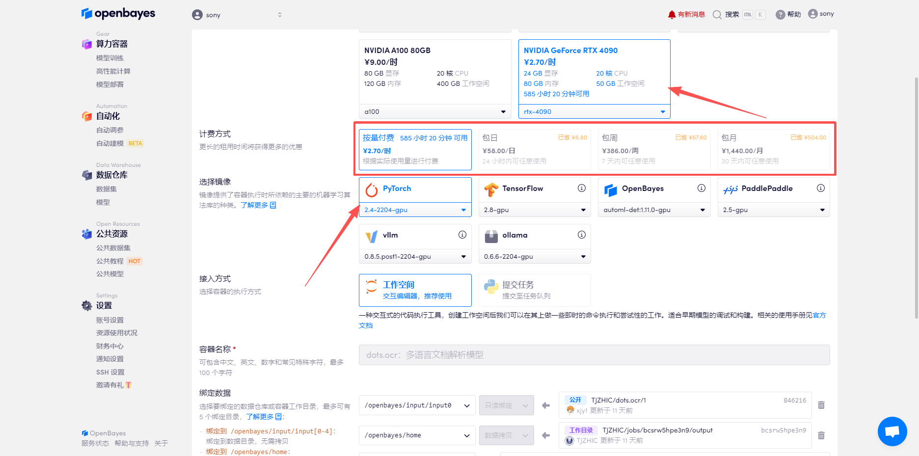 3. 选择「NVIDIA GeForce RTX 4090」以及「PyTorch」镜像,按照需求选择「按量付费」或「包日/周/月」,点击「继续执行」。新用户使用下方邀请链接注册,可获得 4 小时 RTX 4090 + 5 小时 CPU 的免费时长!