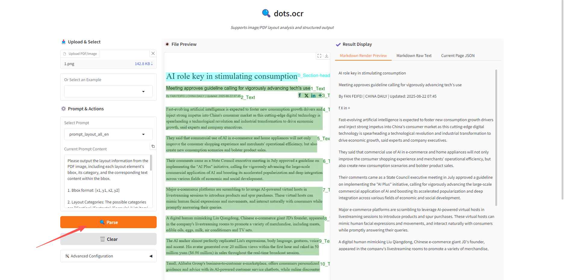 笔者以「Parse」功能为例,上传了一个英文文档,效果如下所示: