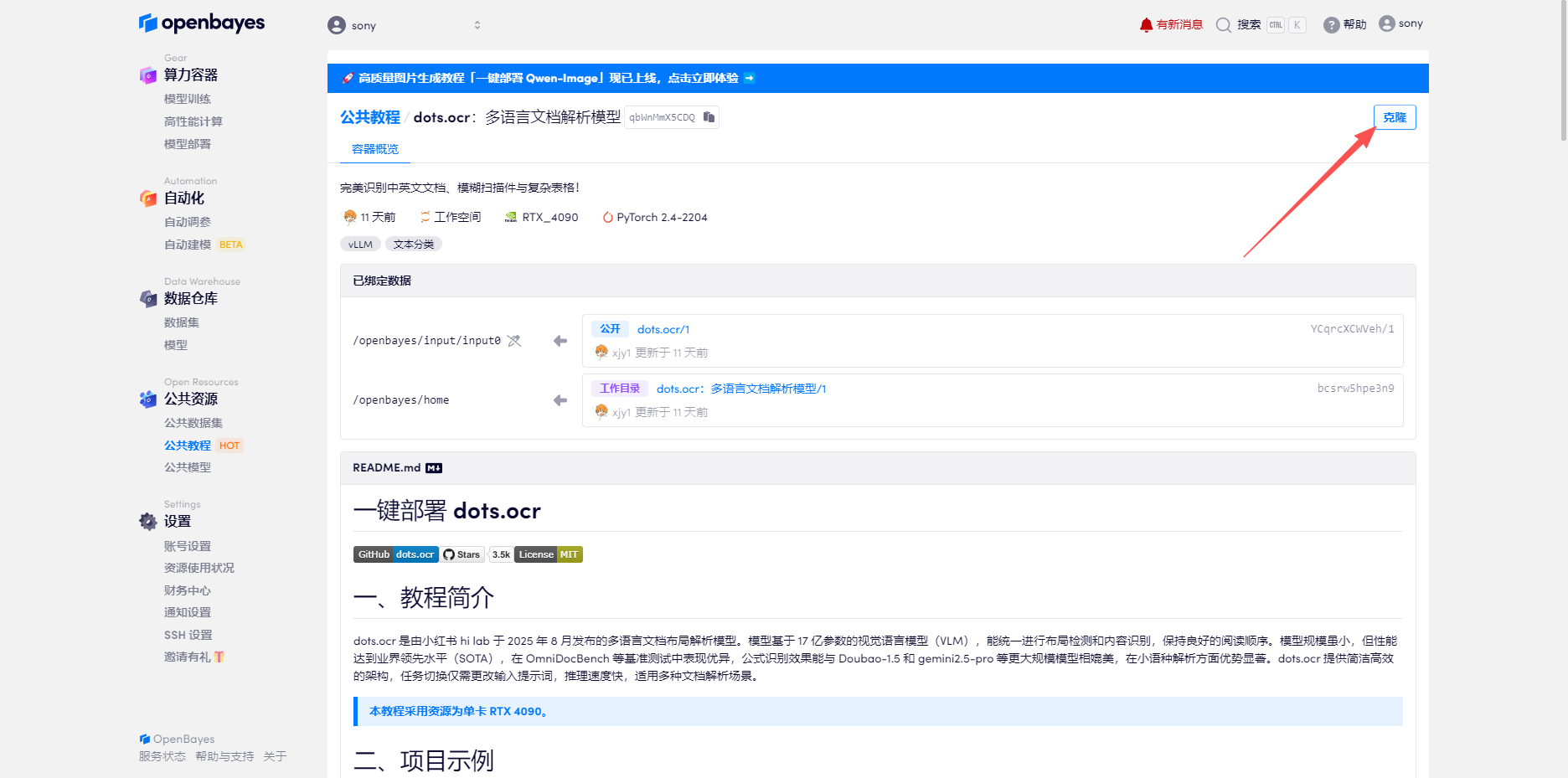2. 页面跳转后,点击右上角「克隆」,将该教程克隆至自己的容器中。
