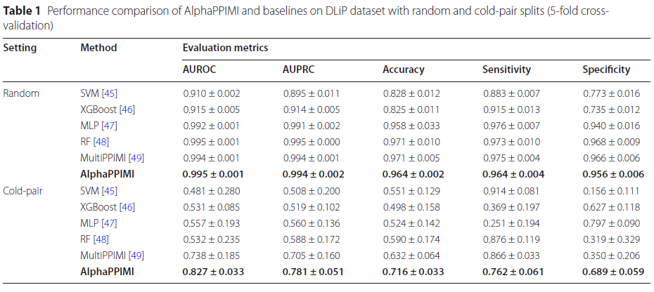 在DLiP数据集上进行的随机划分与冷配对划分实验中,AlphaPPIMI均展现出优越表现。