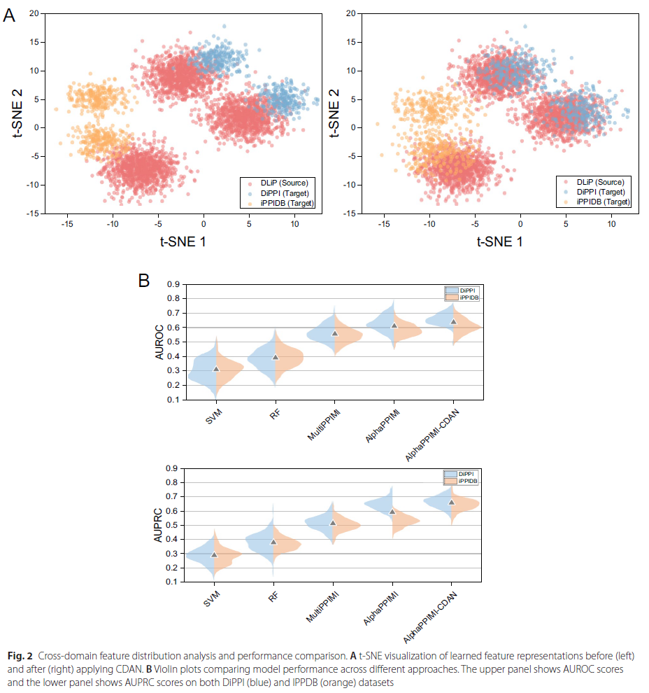 研究人员将模型从DLiP迁移到DiPPI和iPPIDB数据集,结果显示,所有模型在跨域预测时性能有所下降,但AlphaPPIMI结合CDAN后依旧保持最佳表现。CDAN通过类条件对齐,有效解决了不同蛋白家族间的分布偏移问题,并显著提升了模型在新域中的鲁棒性。