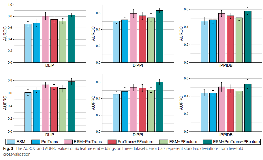结合ESM2、ProtTrans和PFeature三者时性能最高,表明多模态信息融合具有协同效应;