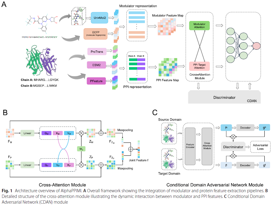 蛋白质–蛋白质相互作用(PPI)通过复杂界面调控关键生命过程,其异常与多种疾病密切相关。因此,识别PPIs及其界面靶向调节剂成为重要治疗策略。然而,发现能够靶向PPI及其界面的分子仍然困难,传统基于结构相似性的策略难以有效刻画这些靶点,尤其是在缺乏已知活性化合物的情况下。研究人员提出了AlphaPPIMI,一个结合大规模预训练语言模型与领域自适应的深度学习框架,用于预测PPI-调节剂互作,尤其针对PPI界面。研究人员构建了系统性的基准数据集,并整合了分子、蛋白和PPI结构特征,结合跨注意力机制与条件域对抗网络(CDAN),显著提升了预测性能。实验表明,AlphaPPIMI在跨域泛化能力和界面特异性预测方面均优于现有方法,为发现PPI调节剂提供了有前景的工具。