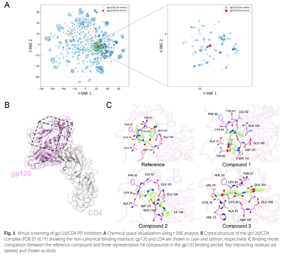 AlphaPPIMI成功识别出可能结合gp120/CD4非典型界面的分子,并通过分子对接展示了其结合方式。这为HIV-1感染阻断提供了新方向。