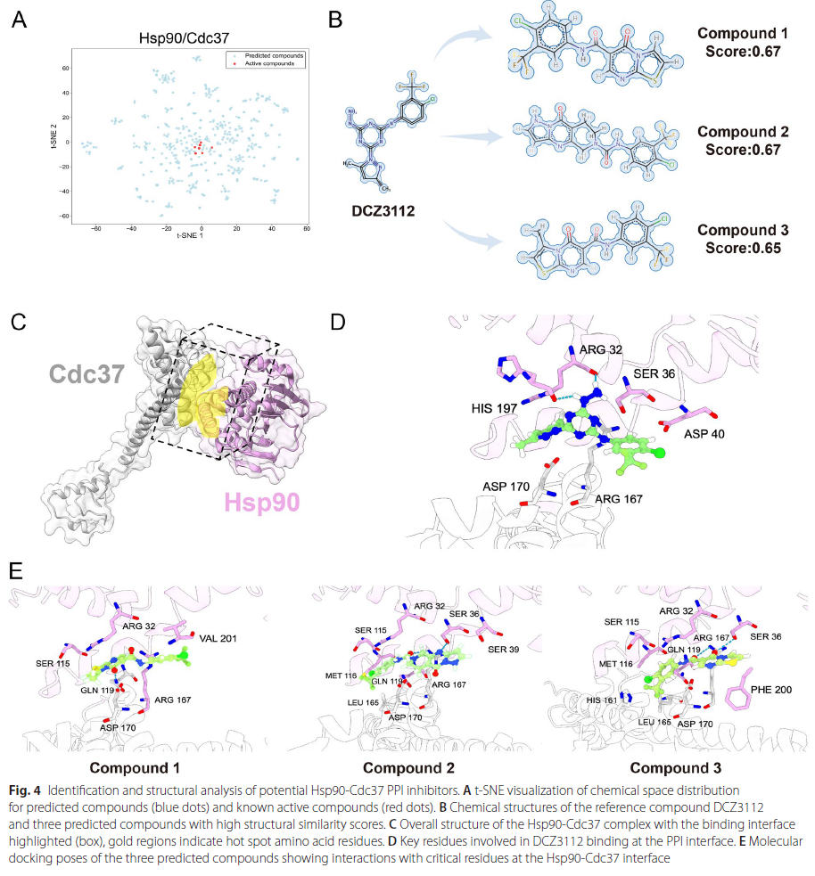 研究人员利用AlphaPPIMI在ChemDiv库中筛选潜在抑制剂,找到与已知抑制剂DCZ3112相似的分子,并在分子对接实验中验证了这些候选分子与关键界面残基(如Arg32、Asp40等)的相互作用模式。