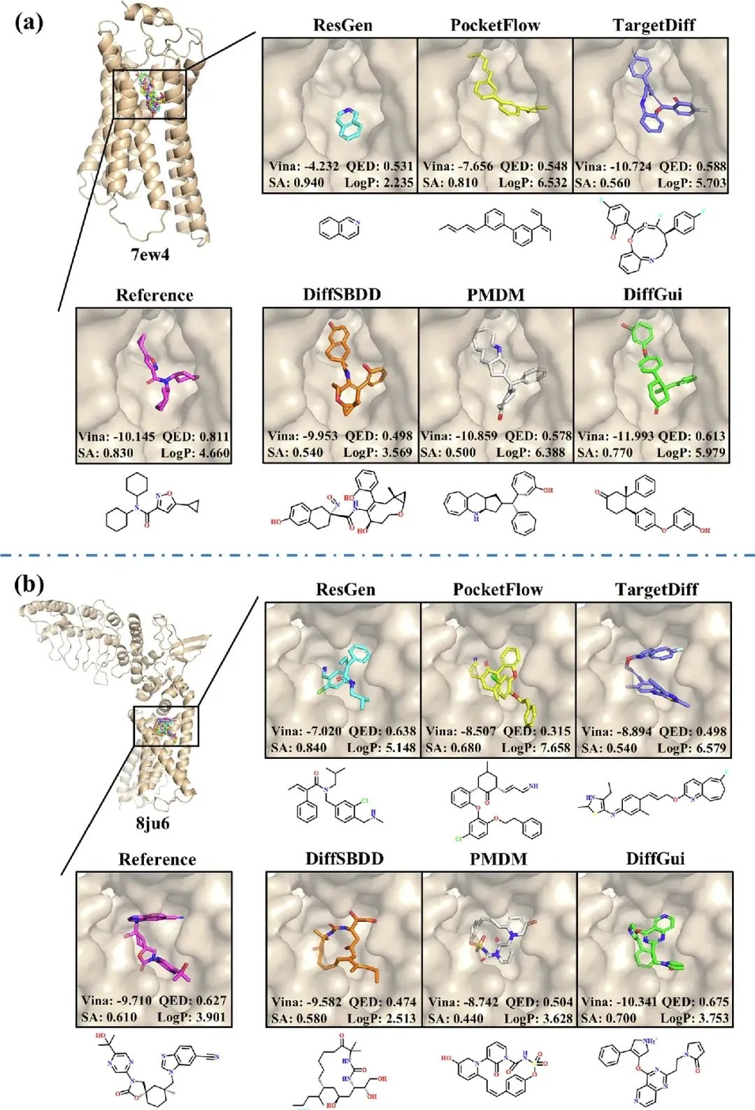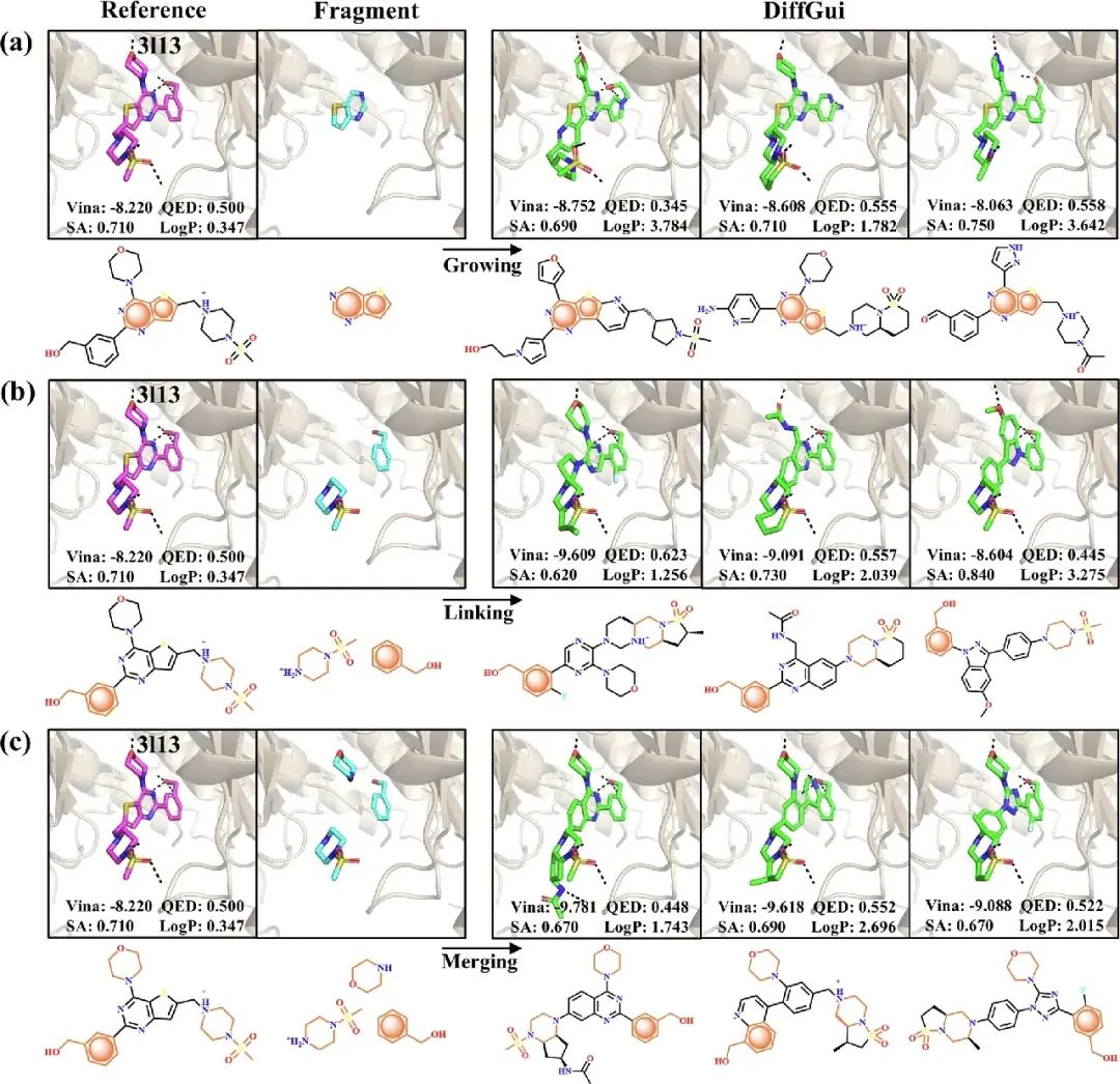 在先导化合物优化任务中,DiffGui 采用“片段去噪” (fragment denoising) 和“片段条件” (fragment conditioning) 两种采样策略,支持片段生长 (fragment growing)、片段连接 (fragment linking) 和片段合并 (fragment merging) 等多种优化方法(图6)。以PI3K (3l13) 为例,模型以噻吩并嘧啶为初始片段,通过片段生长生成的新分子不仅保持了与关键残基(包括Lys802、Ala805、Asp841、Tyr867、Val882和Asp964)的相互作用,还将原结构中的吗啉环替换为呋喃、吡唑等基团,以及将哌嗪磺酰基替换为吡咯烷磺酰基、环化哌嗪磺酰基和哌嗪羰基等不同结构单元,体现出其对蛋白-配体相互作用模式的深刻理解与多样化学空间的探索能力。此外,当提供两个或三个片段时,DiffGui还能分别通过片段连接和片段合并策略进行骨架跃迁,将活性配体的核心支架转化为具有类似功能的新结构。生成分子在Vina评分、类药性 (QED) 和可合成性 (SA) 等方面均优于或至少与参考配体竞争力相当,表明DiffGui可有效推进先导化合物优化进程。