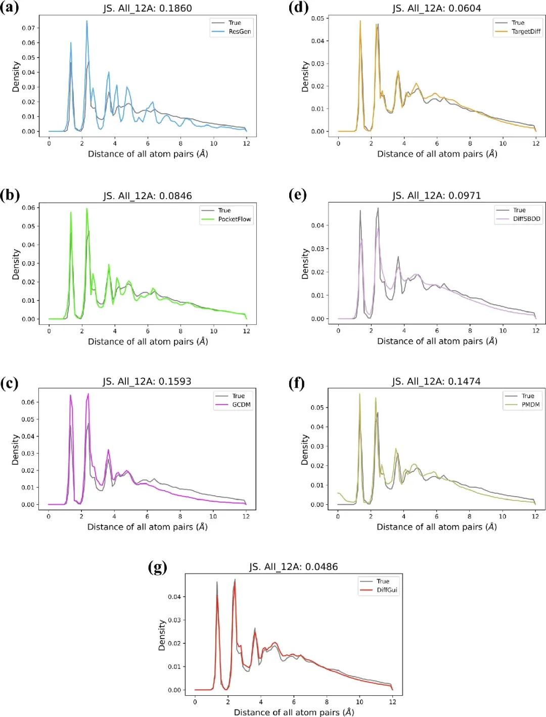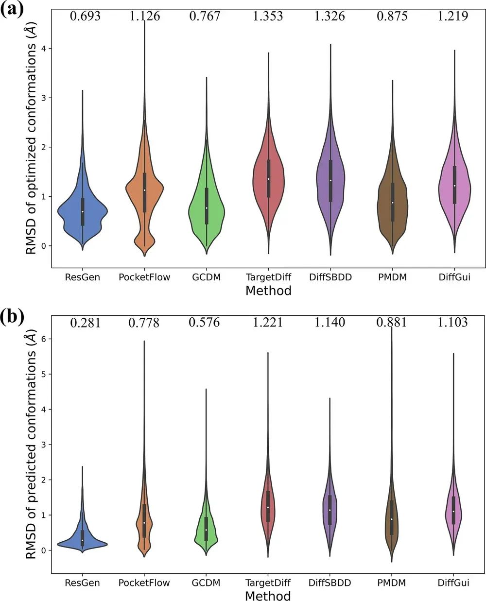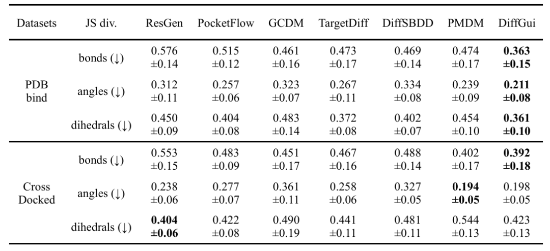 DiffGui 模型在多项评估中都展现出卓越的性能,超越了现有SOTA (State-of-the-Art) 模型。在分子结构合理性方面,DiffGui 生成的分子与真实分子的键长、键角和二面角分布高度相似(表1),其全原子对距离的 Jensen-Shannon (JS) 散度也远低于其他模型。特别是在PDBbind数据集上,DiffGui 的C-C键距离JS散度仅为0.1815,全原子对距离JS散度更是低至0.0486(图2),显示出极高的结构准确性。此外,DiffGui生成的分子中五、六元环占比超过95%,与真实药物分子的环系分布高度吻合。在分子构象准确性方面,DiffGui 生成的分子构象与RDKit优化/预测构象的均方根偏差 (RMSD) 值稳定在1.0 Å左右,这避免了因产生片段化分子或计算简化而导致的伪低RMSD值(分子结构不完整)的问题(图3)。