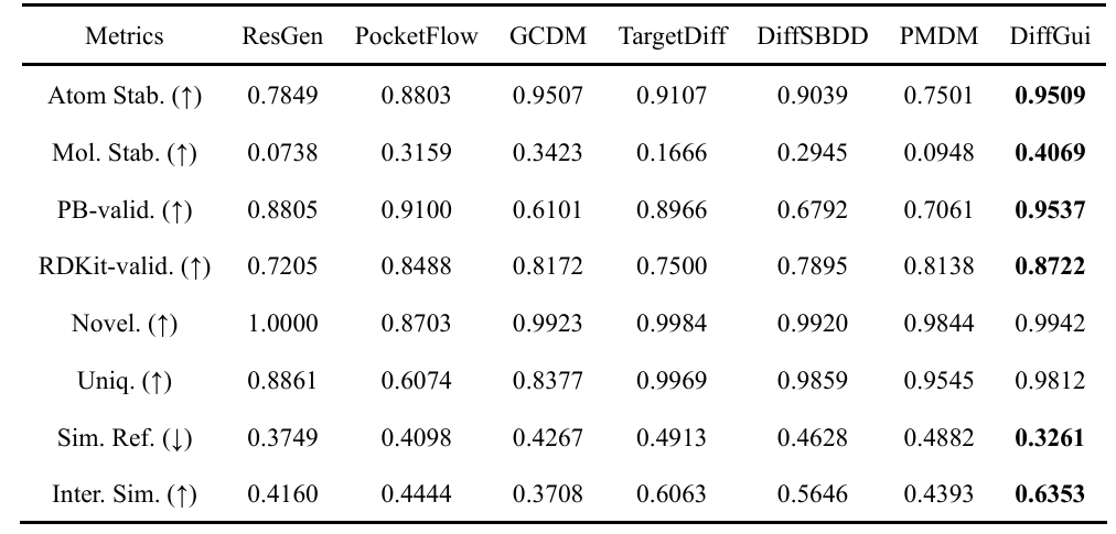 DiffGui已成功应用于全新药物设计与先导化合物优化任务,展现出优异的通用性与实用价值。