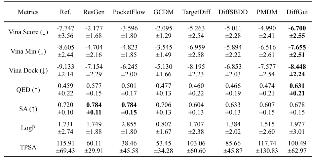 (3). 多属性引导: DiffGui 采用了无分类器的引导策略,在训练与生成过程中融入了多种重要的分子属性。模型引入分子的结合亲和力、类药性 (QED)、合成可及性 (SA)、脂水分配系数 (LogP) 以及极性表面积 (TPSA) 等多属性条件,引导生成兼具高亲和力与优良药物属性的分子。