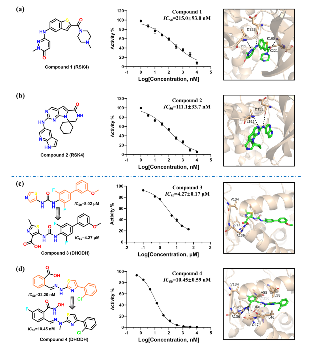 更重要的是,湿实验验证进一步证明了 DiffGui 在药物发现实际应用中的潜力。针对未参与训练的 RSK4(核糖体 S6 激酶 4)靶点,DiffGui 所生成的两个化合物(化合物 1 和 2)在 HTRF 实验中均表现出强效抑制活性,IC₅₀ 值分别达到 215.0 nM 和 111.1 nM,显示出进一步开发的潜力。结合模式分析表明,这两个化合物均能够与 RSK4 结合口袋中的关键残基(K105、D153、L155 和 K221)发生相互作用。