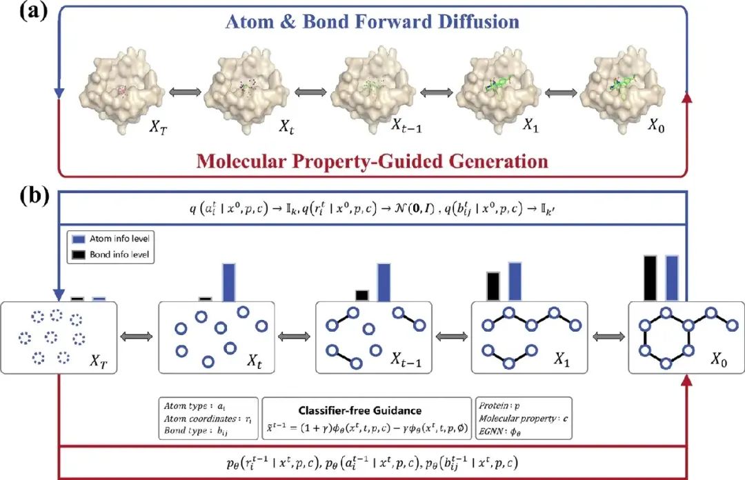 DiffGui提出了一种融合原子-键协同扩散与多属性引导的双机制生成框架(图1)。