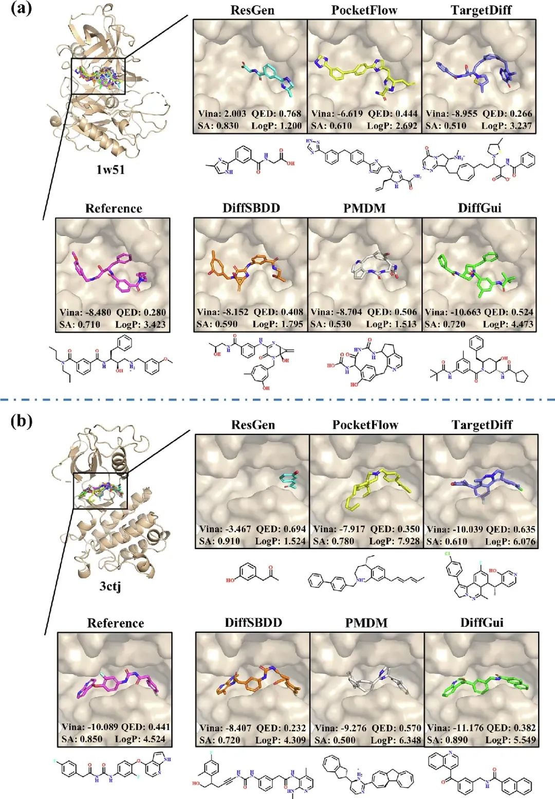 在全新药物设计任务中,DiffGui 展现出优异的跨靶点泛化能力。针对包括β-分泌酶1 (1w51)、酪氨酸激酶 (3ctj)、G蛋白偶联受体 (7ew4) 及离子通道 (8ju6) 在内的多种蛋白靶点,该模型均能生成充分占据结合口袋、且具有合理三维空间匹配的分子(图4,5)。生成分子不仅结构明确,其对接评分和综合性质也优于活性分子及其他对比方法所产生的分子。特别地,除3ctj外,DiffGui 所生成分子的结合自由能 (ΔG) 均低于参考配体,表明其其能够设计出具有更高亲和力的候选分子。此外,在1w51和3ctj两个靶点中,DiffGui 生成分子与参考配体在三维药效团重叠方面表现最优,凸显其准确模拟关键相互作用的能力。为进一步评估生成分子的多样性,作者在其他靶点(如4b5d、5ni7和5ywy)上也进行了测试,结果表明DiffGui能够生成与不同形状口袋精确匹配的多样化分子,其多样性指数达到0.7256,且对接评分和性质均优于参考配体。