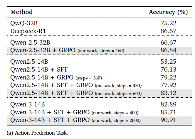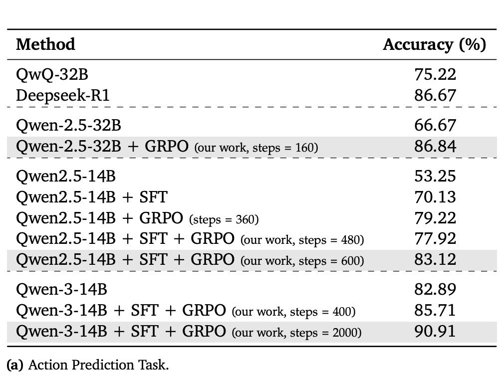 更炸裂的是,靠着这种“边玩边学”的训练方式,让仅14B参数的Qwen-3-14B,干翻了671B的 Deepseek-R1,动作精准度高达90.91%!