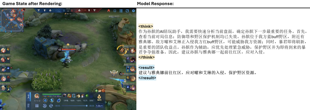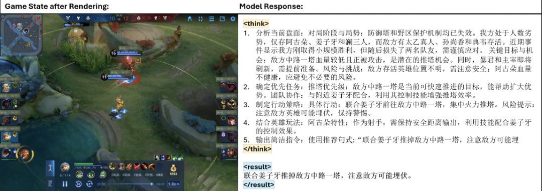 基于此,模型先对游戏状态进行全面评估 。例如,“防御塔和野区保护机制均已失效”(对局已进入中期)。然后分析优先目标(摧毁中路一塔),制定策略(联合姜子牙前往敌方中路一塔,集中火力推塔)并提示风险,