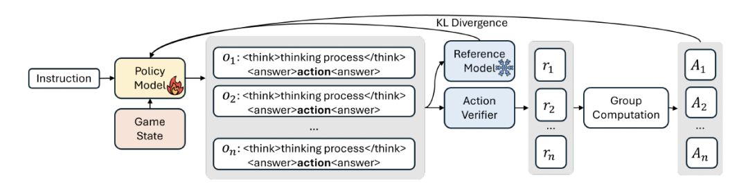 - 在线RL阶段:使用真实游戏数据,并利用GRPO算法训练模型。
