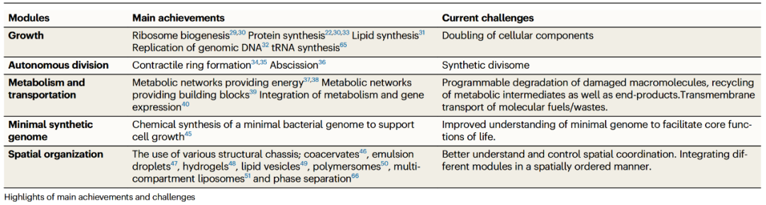 要协同开发出合成细胞,必须完成诸多任务。在峰会上讨论了三大主要科学挑战。首先,必须开发具有功能性的合成细胞模块,这些模块对于完整重现细胞行为至关重要。这需要建立能够实现可重复、模块化与可整合设计的技术,以提升不同模块后续兼容整合的可能性。其次,要克服不同研究团队基于各自专长所开发的多样化化学/合成子系统之间的不兼容性。在构建合成细胞的过程中,随着模块数量增加,如何以互操作且功能化的方式组合与整合组件,其复杂性呈指数级增长。第三,必须确保合成细胞技术免于意外或蓄意的滥用,从而使其能够得到广泛而负责任的应用。关键的合成细胞模块,其在近期所取得的进展以及当前主要挑战见表1。