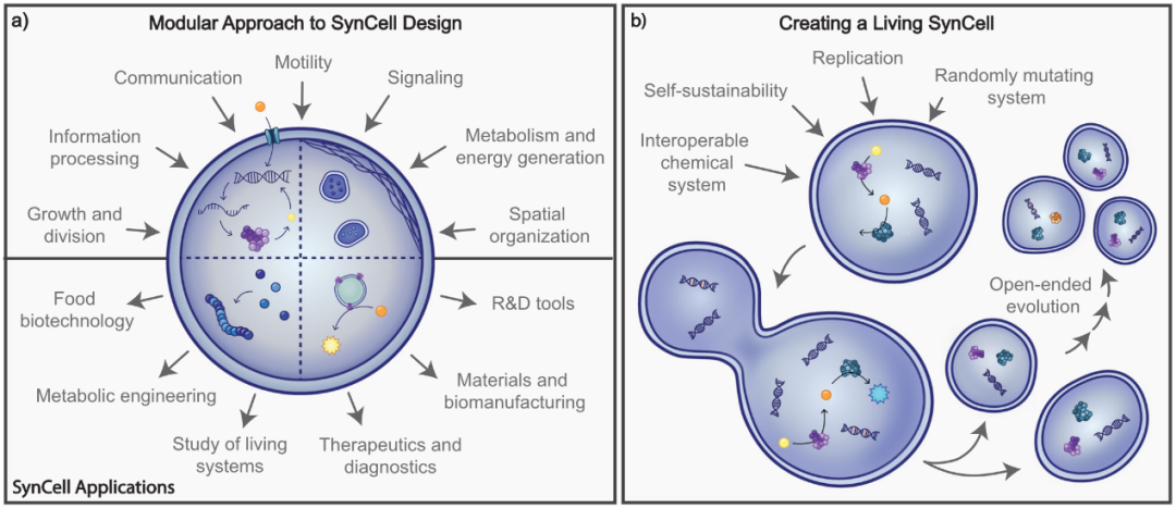“合成细胞”(Synthetic cells, SynCells)通常用来指代那些经过设计、具有细胞大小并能够执行类似生命功能的系统,例如信息处理、运动、生长与分裂、信号传导或代谢(图1a)。另一种定义则认为,合成细胞是能够在特定环境中维持自身并复制,并具有开放性进化潜力的物理化学体系(图1b)。前一种定义强调通过模块化方法重构各种生物学特征,但不包括复制与进化;而后一种定义则突出一个完全互操作的合成细胞具备复制与进化的能力,而这正是探究生命演化本质的关键。