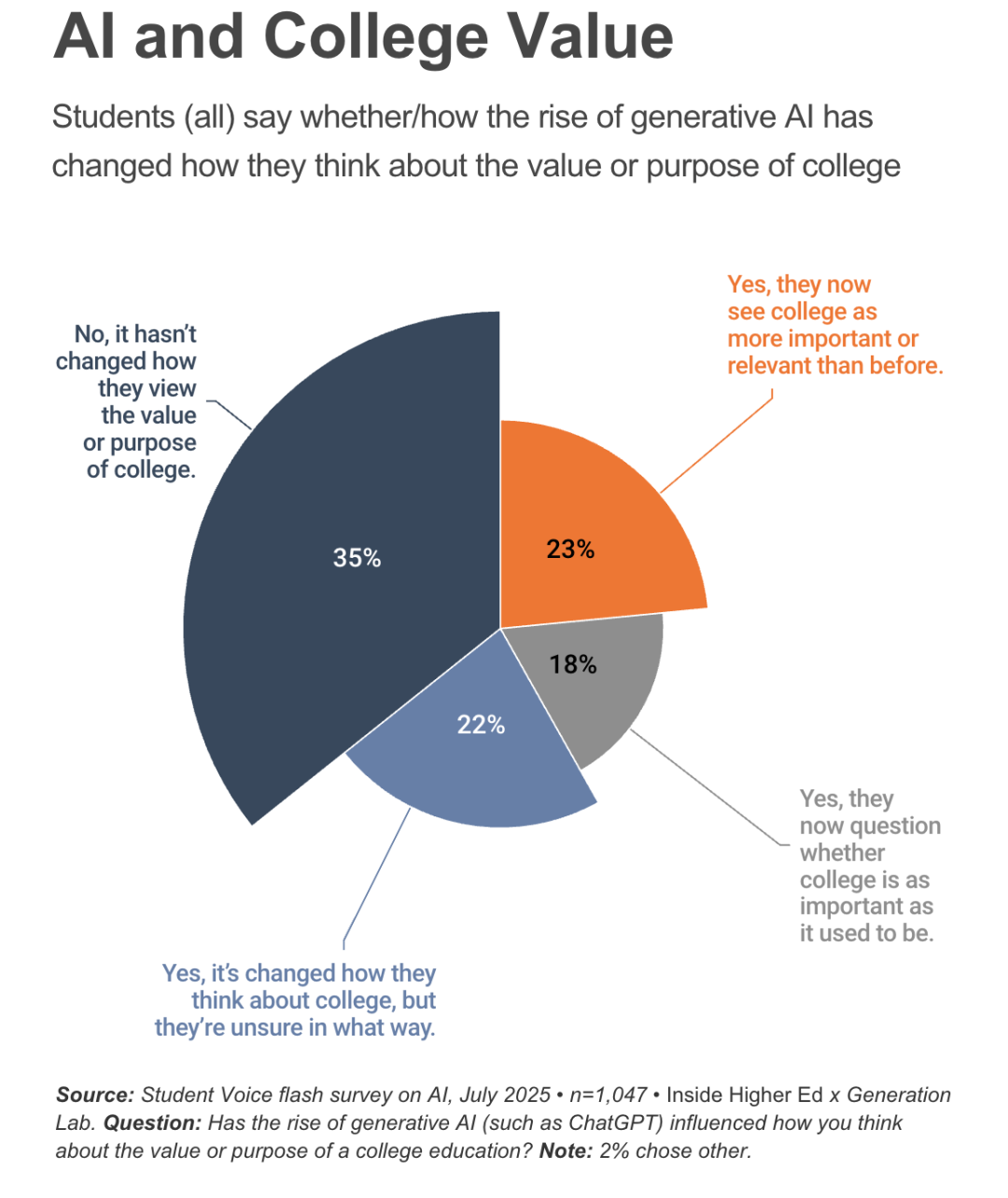 学生的认知存在分歧:35%认为价值未发生变化,23%认为价值提升,仅18%表示比以往更质疑大学价值。